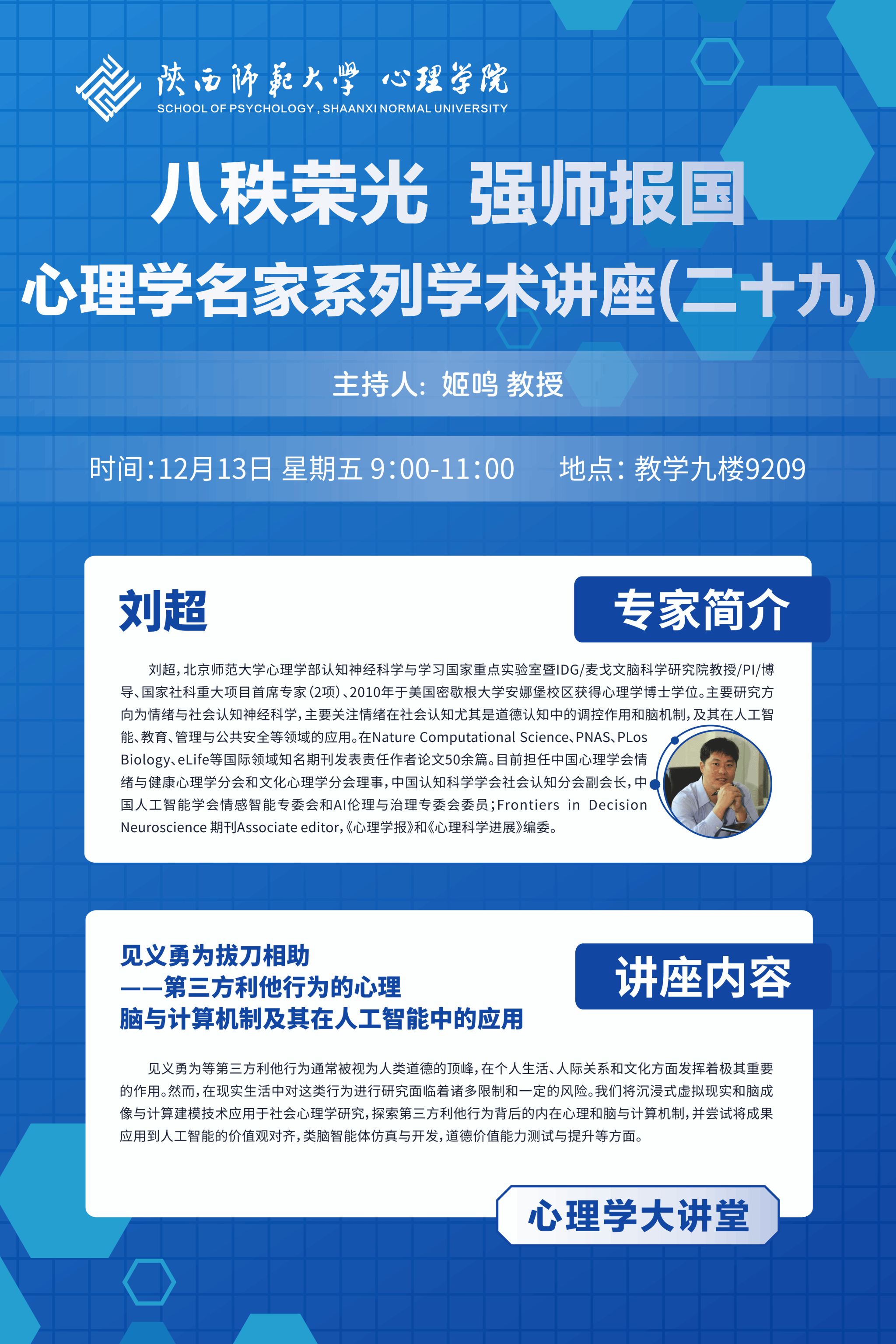 报告题目:见义勇为拔刀相助——第三方利他行为的心理、脑与计算机制及其在人工智能中的应用